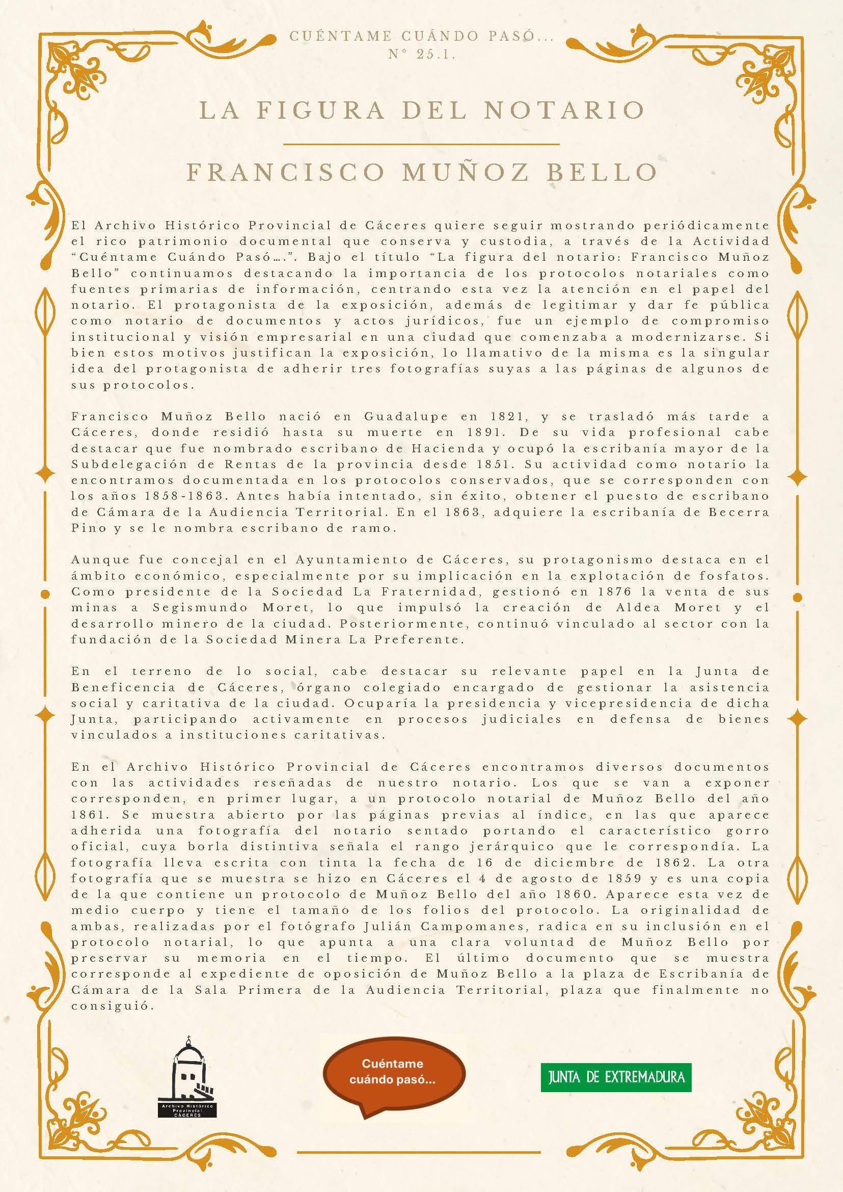 Destacamos la figura de Francisco Muñoz Bello, notario de Cáceres en el siglo XIX, que sobresale por la original idea de adherir fotografías suyas en los protocolos notariales. Expondremos dos fotografías de los años 1859 y 1862 realizadas por el fotógrafo Julián de Campomanes, que se insertan en protocolos de los años 1860 y 1861.